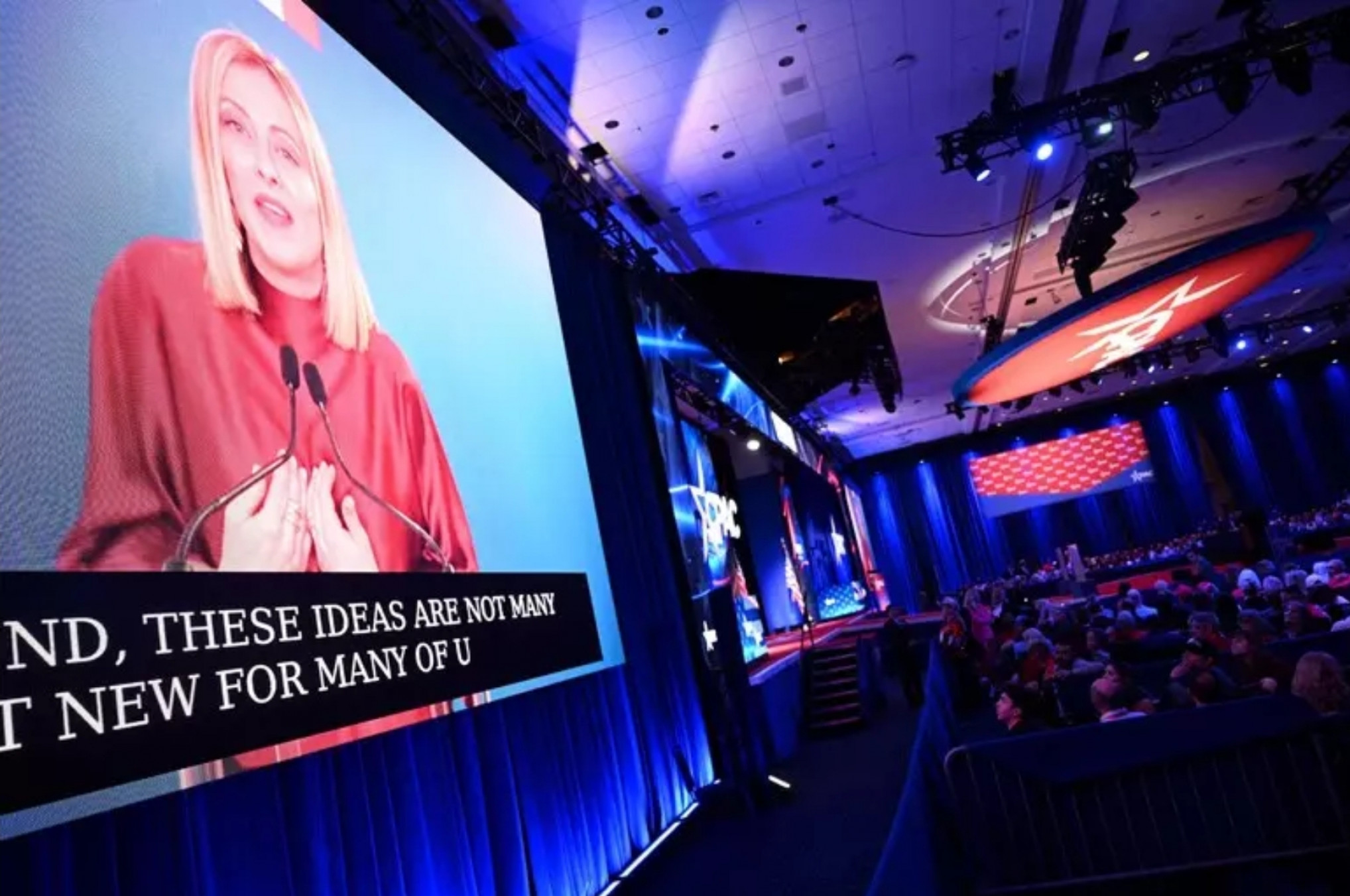 Meloni discursa para público da Cpac em Washington Foto: Ansa/AFP