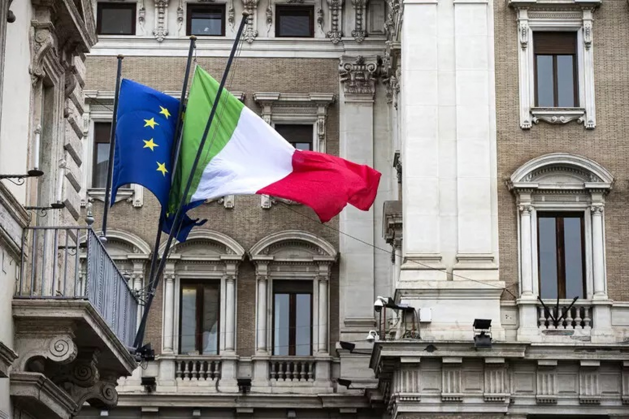 Bandeiras da Itália e da UE no Palácio Chigi, sede do governo, em Roma Foto: Ansa
