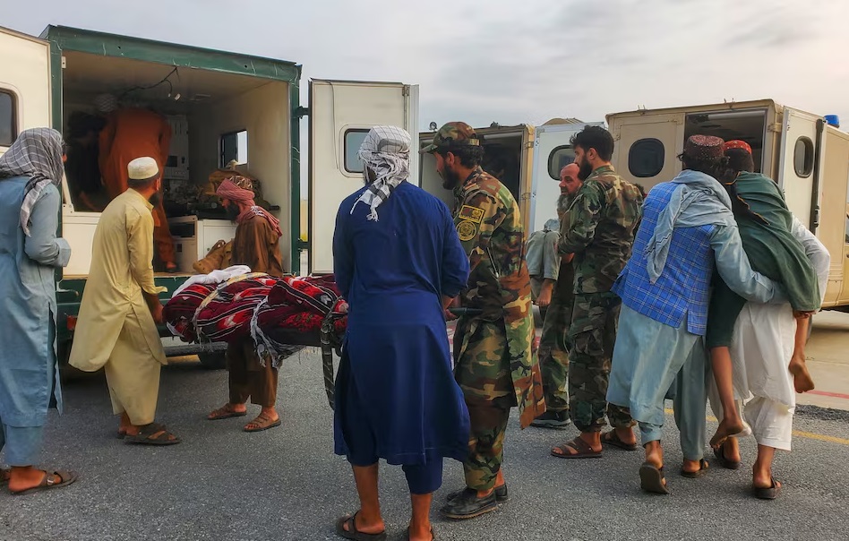 Soldados e civis do Talibã carregam vítimas do terremoto para uma ambulância em um aeroporto em Jalalabad Foto: Reuters