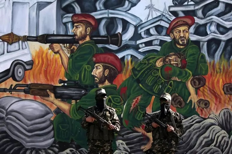 Dois guerrilheiros do Hamas aparecem em frente a um mural na cidade de Gaza (arquivo) Foto: Ansa