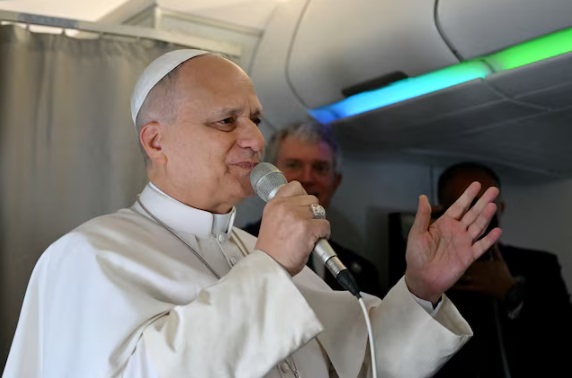 O Papa Leão XIV se dirige a jornalistas durante voo com destino à Argelia, onde permanecerá por 11 dias em visita de Estado Foto: Alberto Pizzoli/pool via Reuters