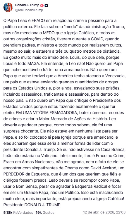 "O Papa Leão é FRACO em relação ao crime, e terrível para a política externa", escreveu o presidente em um post no Truth Social.
