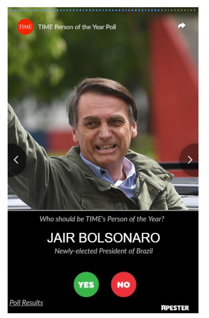 A revista norte-americana Time incluiu o presidente eleito, Jair Bolsonaro, em uma enquete que vai ajudar a decidir quem é a personalidade do ano, que estampa a tradicional capa da edição de dezembro da publicação.