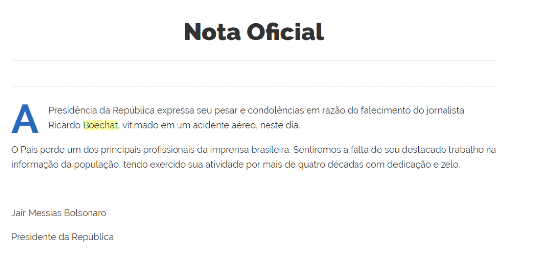 "A Presidência da República expressa seu pesar e condolências em razão do falecimento do jornalista Ricardo Boechat, vitimado em um acidente aéreo, neste dia. O País perde um dos principais profissionais da imprensa brasileira. Sentiremos a falta de seu destacado trabalho na informação da população, tendo exercido sua atividade por mais de quatro décadas com dedicação e zelo", diz a nota divulga pela secretaria de comunicação da Presidência.