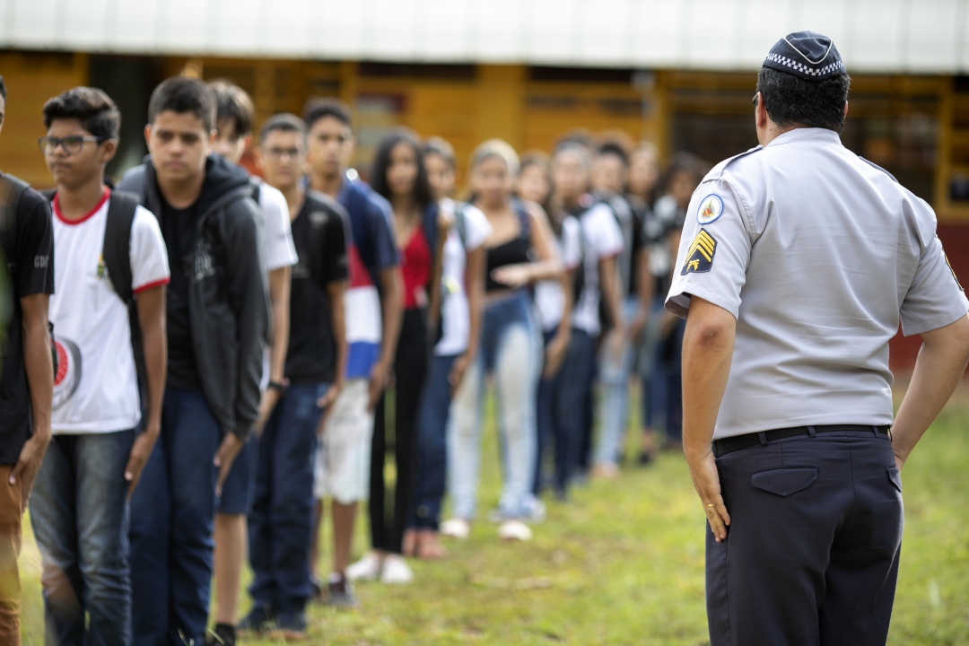 Em um colégio público no entorno de Brasília, um sargento explica a um grupo de cerca de 20 alunos de 13 e 14 anos que as regras mudaram: a partir de agora deve-se fazer fila para entrar em sala de aula, os meninos devem ter cabelo curto e as meninas, prendê-lo em um coque, no estilo militar.