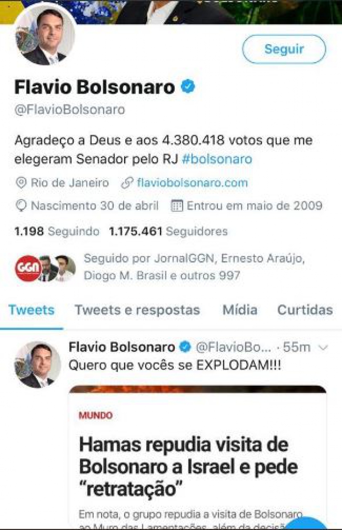 O senador Flávio Bolsonaro (PSL-RJ), filho do presidente Jair Bolsonaro, publicou nesta terça-feira, 2, no Twitter, uma espécie de "resposta" ao movimento palestino Hamas, que criticou a visita do chefe do Executivo brasileiro a Jerusalém. "Quero que vocês se EXPLODAM!!!", postou Flávio Bolsonaro, com a imagem do título de uma reportagem que noticiava as críticas do grupo à visita.