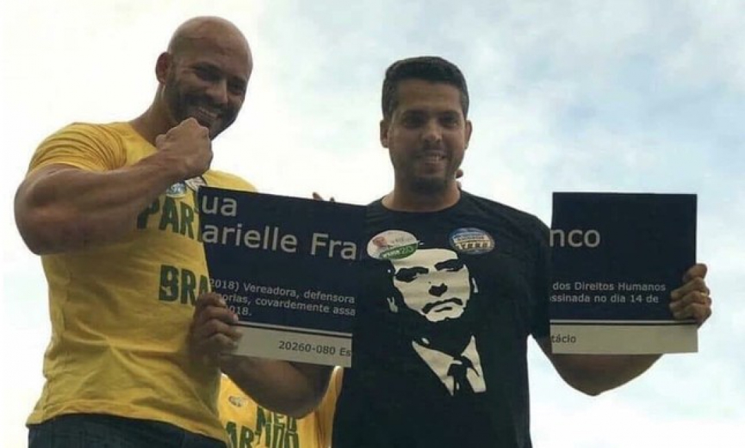 O homem que aparece na foto que repercutiu nas redes sociais, mostrando uma placa da Rua Marielle Franco, no Rio, quebrada, foi candidato a vice-prefeito da cidade, na chapa de Flávio Bolsonaro, há dois anos. Neste ano , Rodrigo Amorim (na foto, à direita) concorre a uma vaga na Alerj. As informações são de Lauro Jardim.