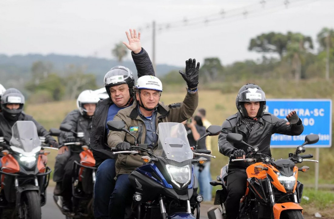O presidente Jair Bolsonaro e o prefeito de Chapecó João Rodrigues, durante 'motociata' com apoiadores na cidade, em junho de 2021 Foto: Folhapress / Tarla Wolski