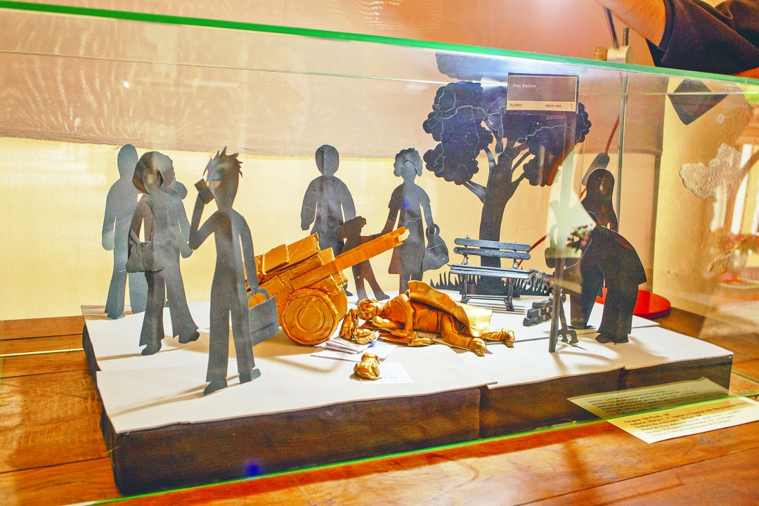 Uma das maiores surpresas é o presépio confeccionado em 2015 em papel reciclado por Maria Santos, com as crianças das obras sociais de Nossa Senhora Achiropita, na Bixiga, em São Paulo. O foco central é um burro sem rabo (carroça usada pela população de rua para transportar suas quinquilharias) cheio de papelão, com um mendigo dormindo no chão ao lado, representação do Cristo adulto. Uma mini manjedoura com o menino Jesus, José e Maria compõe o conjunto, realçado pela cor dourada. Ao redor, anônimos em papel negro observam a cena com alguma indiferença, e uma placa de sinalização de rua indica o endereço, na confluência das ruas Belém com Esperança. “É uma atualização da gruta com a grande sacada de que Deus veio ao mundo criança, para permitir que a humanidade consiga fazer o encontro com o sagrado, com valores como a dignidade, a paz, respeito e solidariedade”, ensina o frei capixapa Roger Brunorio, 45 anos, da Ordem Franciscana.